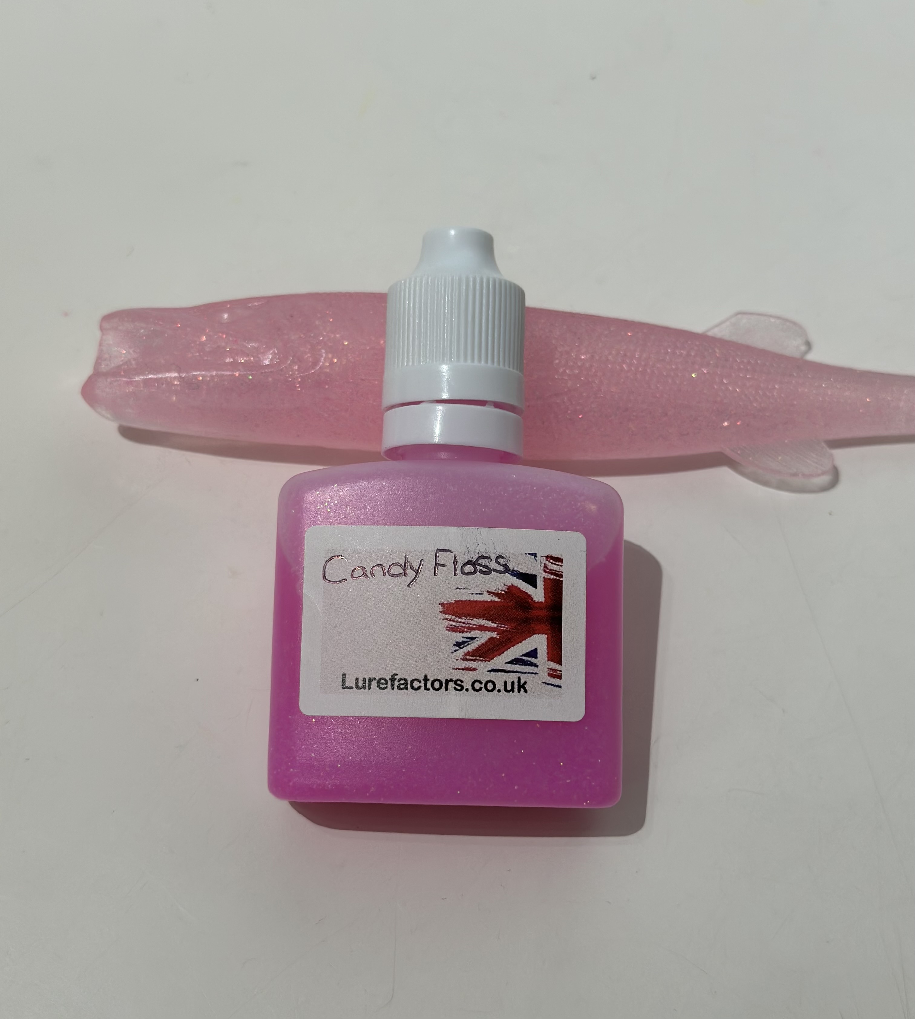 30ml bottles of lureflex Candy floss sherbet colour A dull pastel type colour used on its own or to create effects with fluros etc Formulated for soft plastic production. Colours can be mixed to create more colours