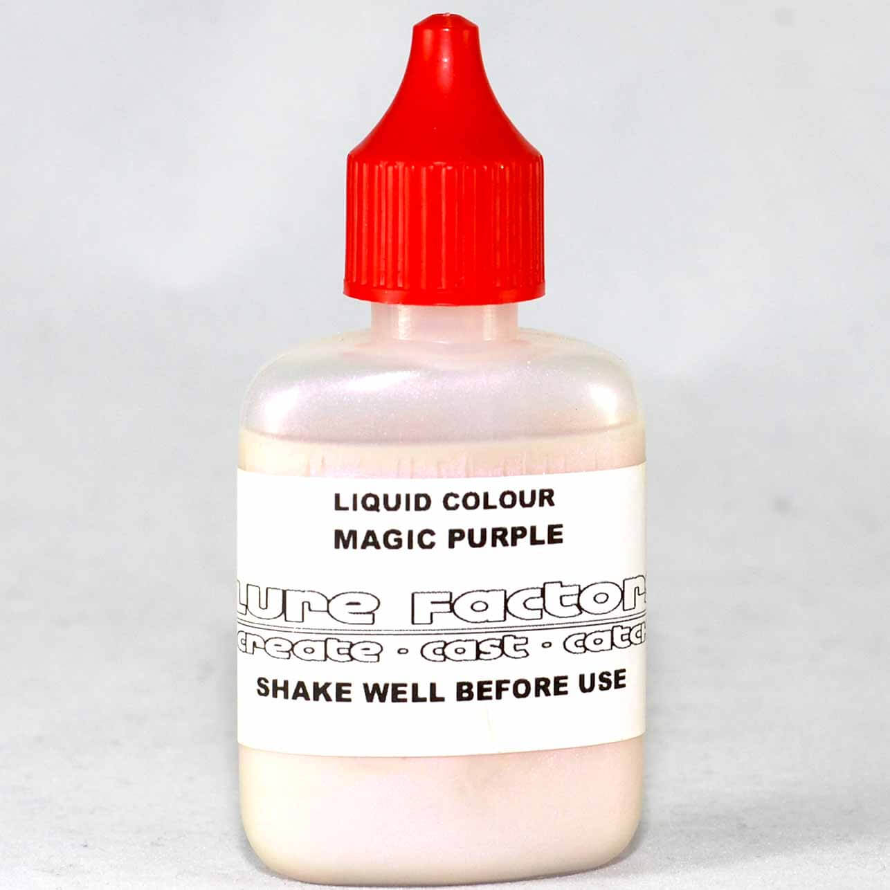 30ml dropper bottle of iridescent liquid colour These special Iridescent colours have a light background and the colour shines through when light hits the surface of your lure, very much like the scales of a fish or the surface of a shell. They can also be mixed with our standard colours for a special effect. Iridescent Blue is a similar colour to Redgill's blue pearl Iridescent Violet is a similar colour to Redgill's red pearl Each bottle is enough to colour approx. 10 litres of Liquid Plastic.